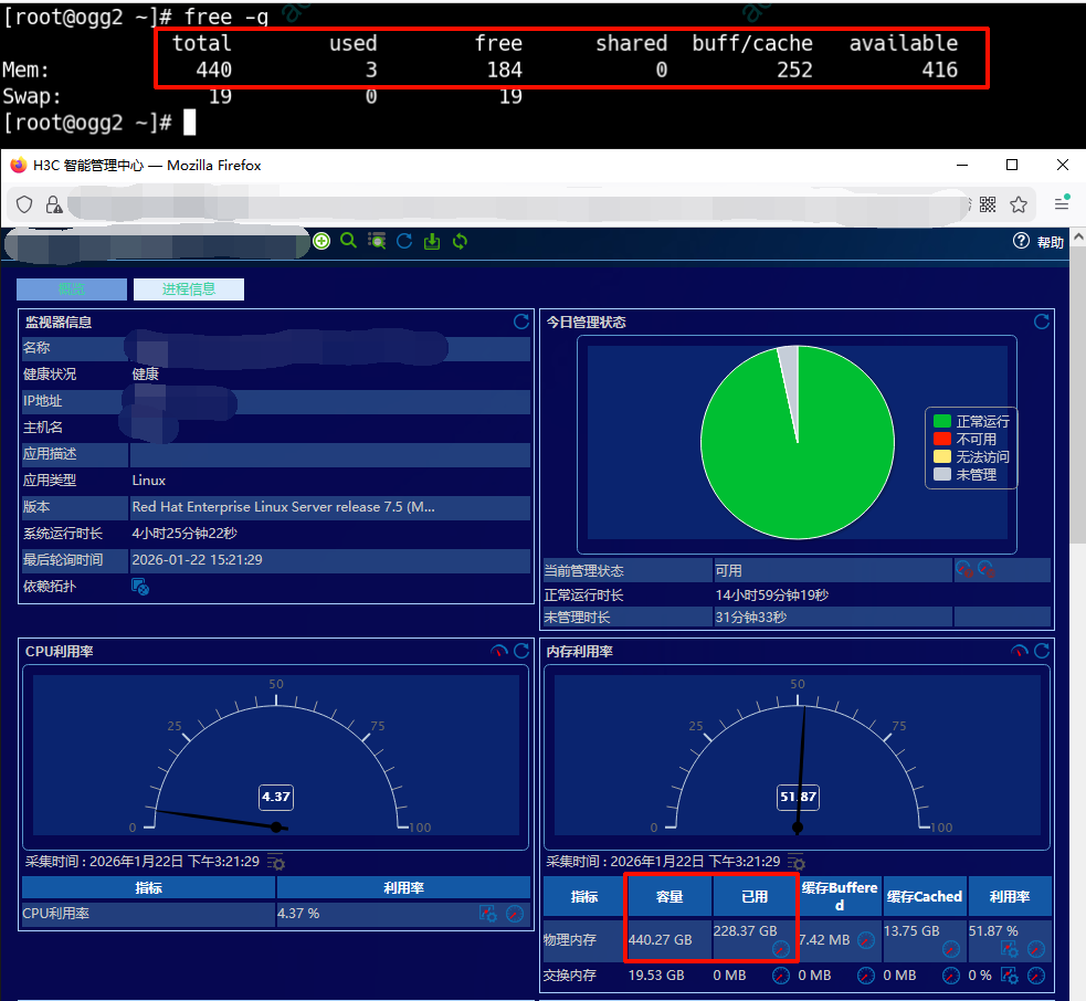 根据iMC对Linux主机的监控机制,差异源于SNMP协议中内存计算方式与系统命令free的统计逻辑不同。以下是具体原因和计算逻辑: