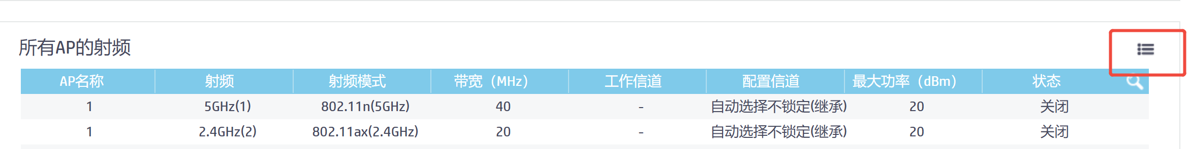 单击页面左侧导航栏的“无线配置 > 射频管理 > 射频配置”,然后点击所有ap的射频,然后对应点击修改ap的射频功率。