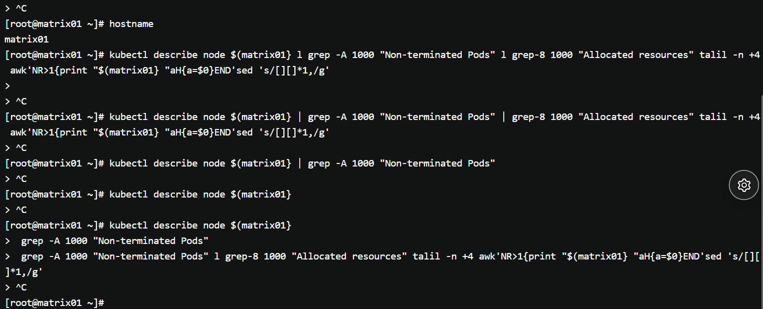 kubectl describe node $(matrix01} l grep -A 1000 "Non-terminated Pods" l grep-8 1000 "Allocated resources" talil -n +4 awk'NR>1{print "$(matrix01} "aH{a=$0}END'sed 's/[][]*1,/g'