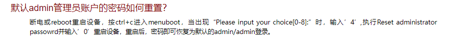 (2) 进入menuboot按选项4,即可重置管理员密码,默认为admin。显示“Reset admin password success”表示成功。