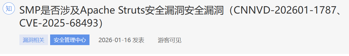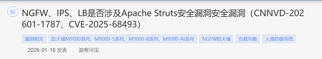 关于Apache Struts2存在XML注入漏洞的风险提示】近期,应用广泛的Web应用开发框架Apache Struts2被披露存在XML注入漏洞(漏洞编号:CVE-2025-68493)
