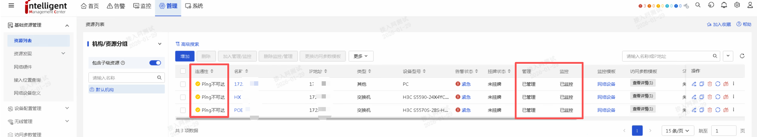 ADCampus设置自动发现任务,纳管三台交换机后,提示ping不通设备