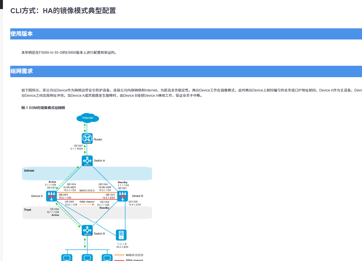 镜像模式是一种特殊的主备模式,部署方式与主备模式相同。在镜像模式下,两台设备的接口(镜像模式管理接口和RBM通道接口除外)使用相同的IP地址,正常情况下同样由主设备处理业务,备设备处于待命状态;当主设备接口、链路或整机故障时,备设备立即切换为主设备,接替原主设备处理业务。