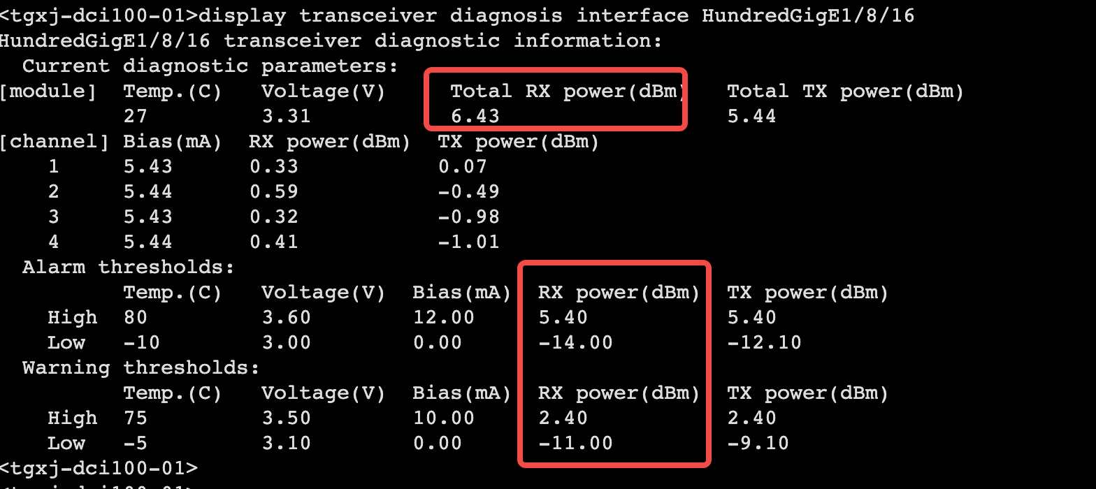 RX power(dBm) | 数字诊断参数——接收光功率,单位为dBm,精确到0.01dBm |