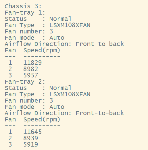 您观察到的情况:图片显示1号风扇转速最高,这通常是因为它被系统逻辑分配为为主控板或高热密度板卡散热。当设备业务负载较高、环境温度上升或机箱内部气流不畅时,1号风扇会率先加速,这是系统智能散热策略的体现。只要状态显示为 “Normal”,就说明转速在预期范围内,设备没有过热风险。