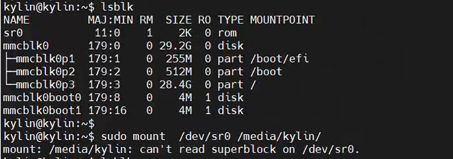 mount: /media/kylin: can't read superblock on /dev/sr0.
