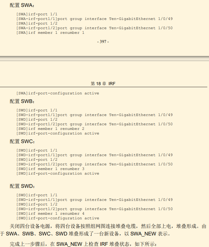 IRF物理口:这是设备上实实在在的端口(如 Ten-GigabitEthernet 1/0/49),负责在成员设备之间传输IRF相关数据。一个逻辑口可以绑定一个或多个物理口。绑定多个物理口可以实现链路冗余和带宽叠加,这也是IRF提高可靠性和性能的关键机制。