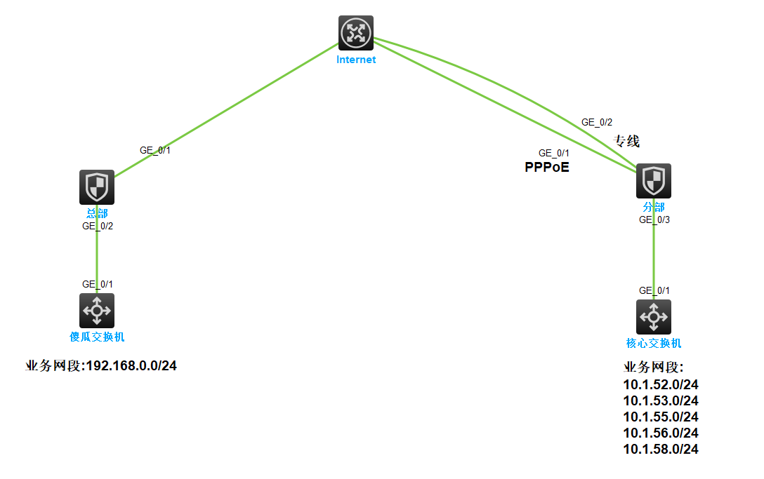 两台防火墙F100-C-G5-SI组建ipsec vpn,总部只有一条专线,分部有两台外线,分别是一条PPPoE拨号和一条专线。现在需求:分部两条外线同时和总部建立ipsec vpn,专线为主,PPPoE为备,形成主备模式,并且分部业务流量全部走PPPoE到外网,ipsec vpn流量全部走专线,当PPPoE出现故障后,再把业务流量走专线。请问以上要求如何配置