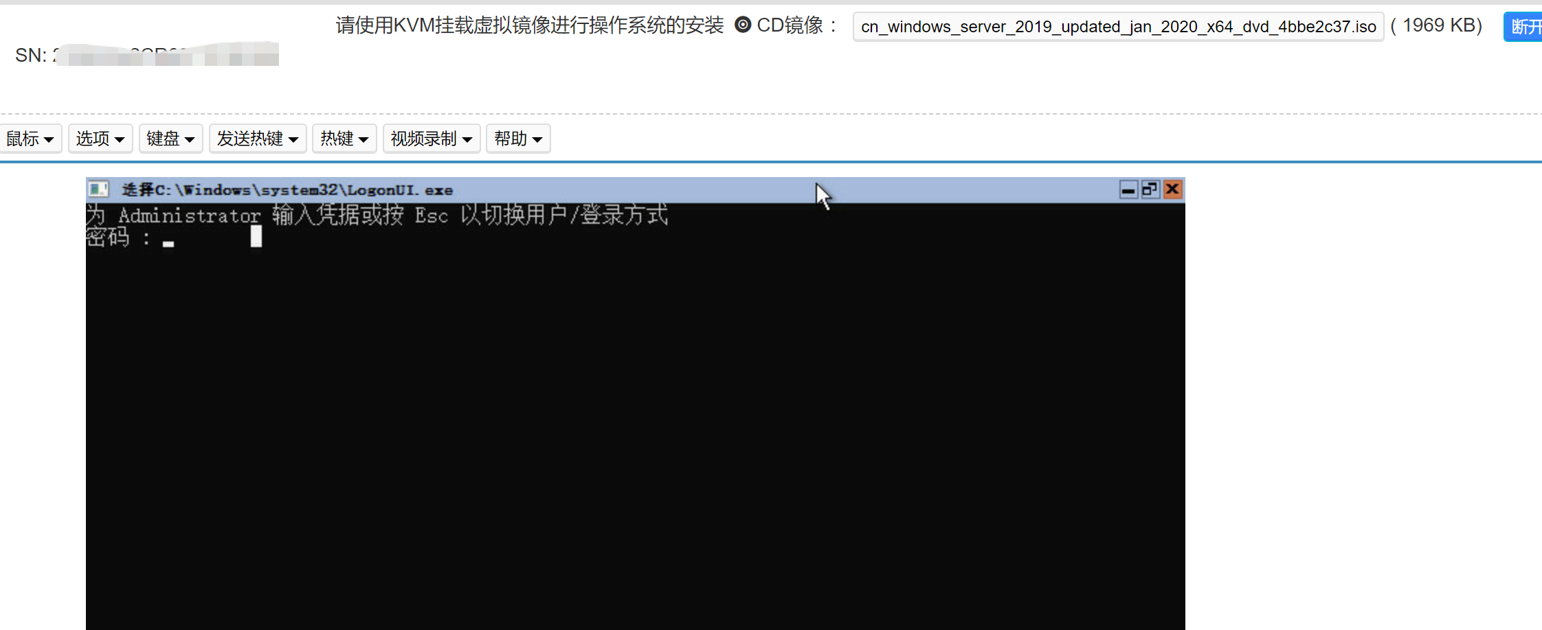 C:\Windows\system32\LogonUI.exe,这说明服务器没有从虚拟光驱(ISO)启动,而是直接从本地硬盘的旧系统启动了,所以才会弹出 Administrator 密码输入框。