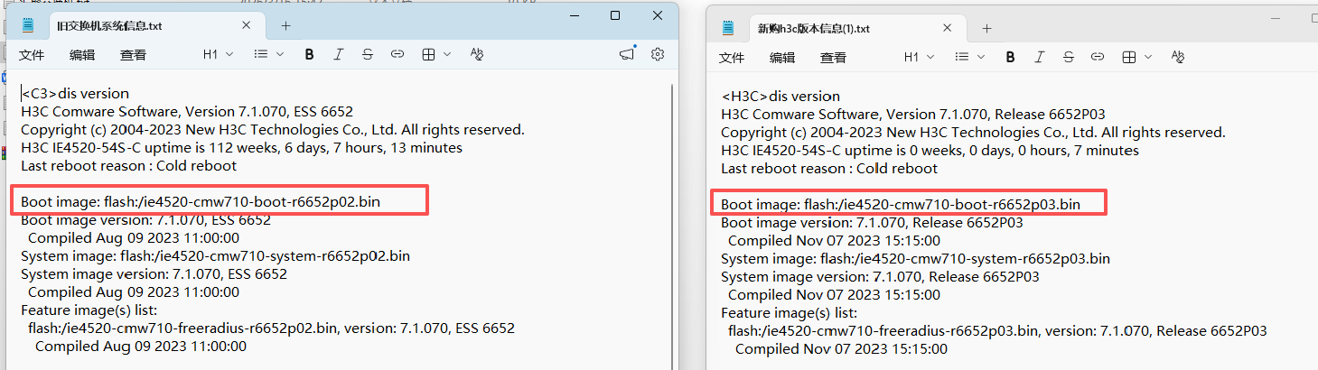 指定下次启动时使用该版本文件:boot-loader file flash:/IE4520-54S-C-CMW710-R6652P02.ipe slot 1 main
