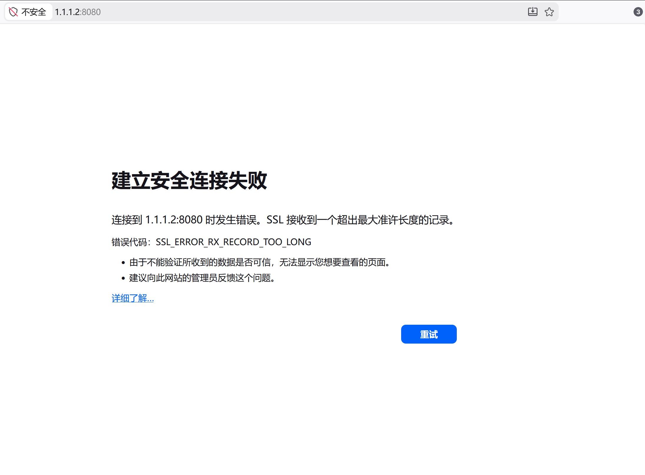 http://1.1.1.2:8080 访问。在界面打开显示建立安全连接失败