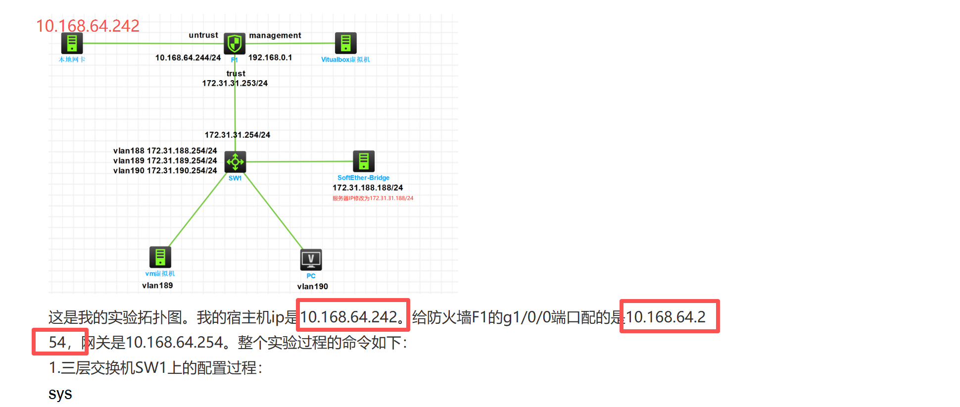 这是我的实验拓扑图。我的宿主机ip是10.168.64.242。给防火墙F1的g1/0/0端口配的是10.168.64.254,网关是10.168.64.254。整个实验过程的命令如下:
