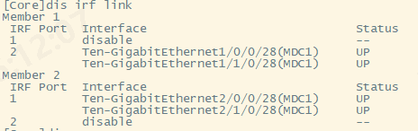 [Core]dis irf link Member 1 IRF Port Interface Status 1 disable -- 2 Ten-GigabitEthernet1/0/0/28(MDC1) UP Ten-GigabitEthernet1/1/0/28(MDC1) UP Member 2 IRF Port Interface Status 1 Ten-GigabitEthernet2/0/0/28(MDC1) UP Ten-GigabitEthernet2/1/0/28(MDC1) UP 2 disable --