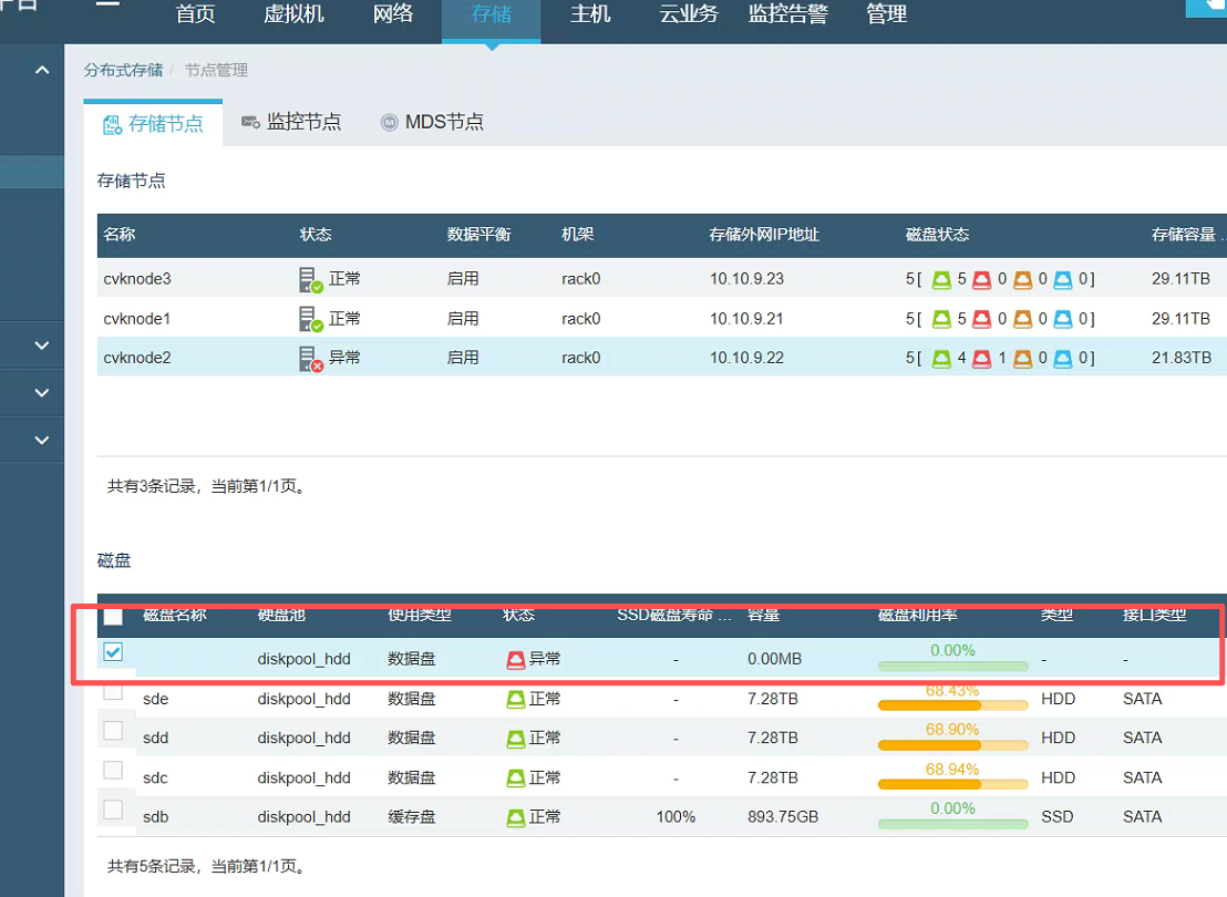 从截图来看,cvknode2节点的磁盘确实处于异常状态,通常是由于磁盘存在旧分区信息或元数据残留,导致平台无法识别,这种情况在扩容操作中比较常见。处理这个问题的整体思路是:先在 Web 界面完成物理更换,然后到后台使用命令彻底清理磁盘的“记忆”,最后回到 Web 界面完成扩容。