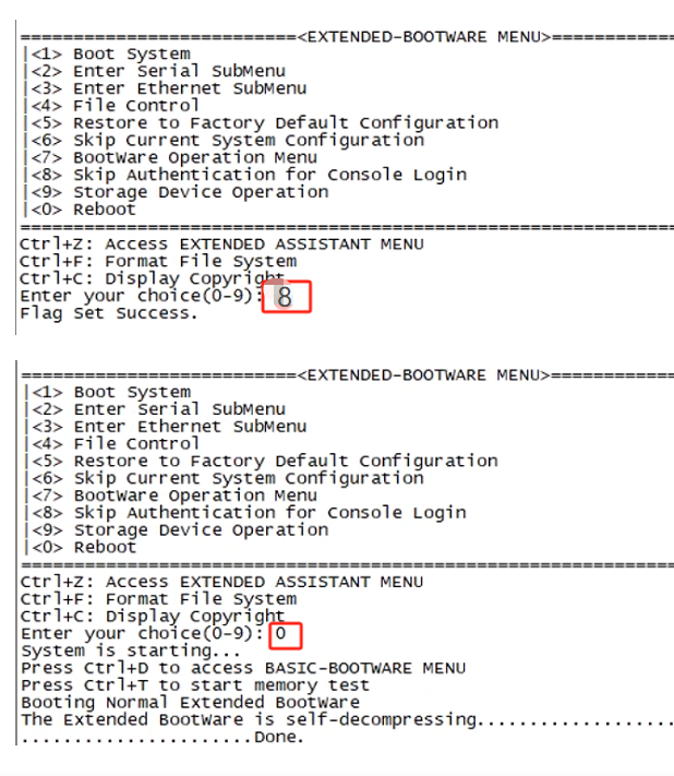 选择跳过密码:在 BootWare 主菜单中,输入 8 并按回车,选择跳过 Console 密码认证。
