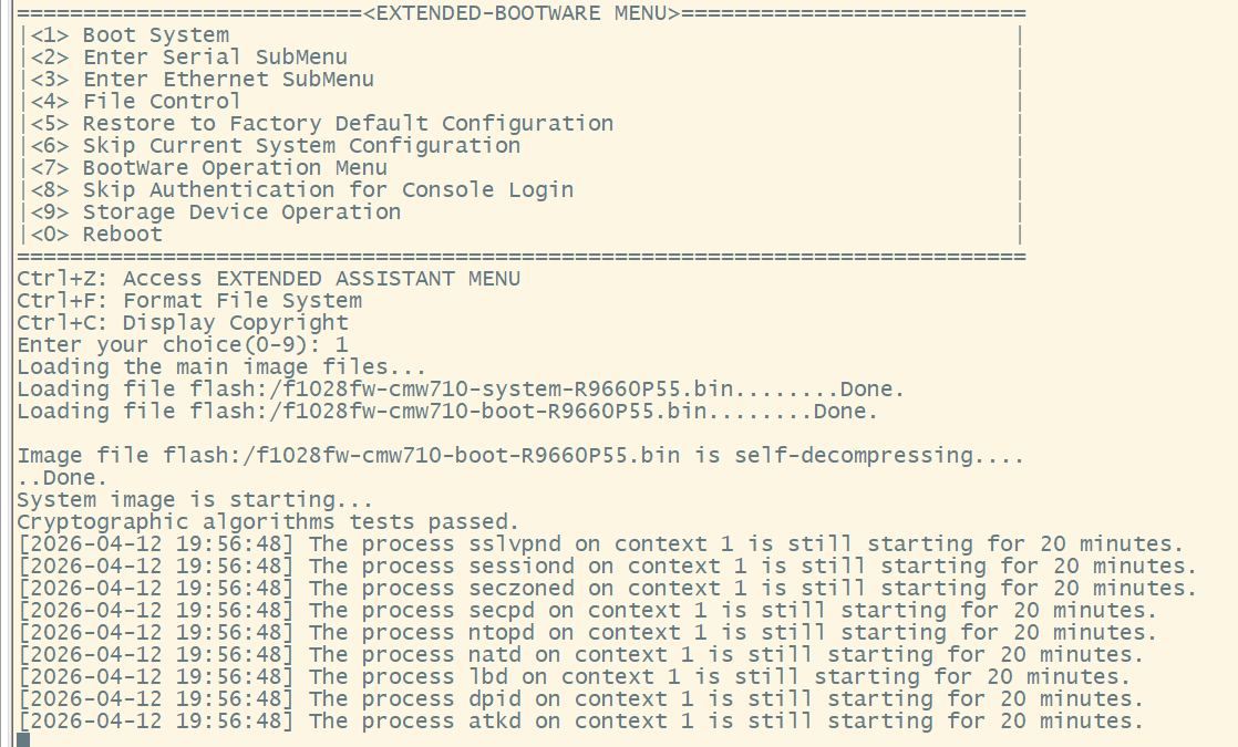 你现在的情况是:防火墙升级后核心业务进程(sslvpnd、sessiond、natd 等)全部启动超时卡死,正常 H3C 防火墙启动时间不会超过 10 分钟,卡 30-40 分钟已经是严重故障,继续等只会浪费时间,甚至可能损坏 Flash 文件系统。