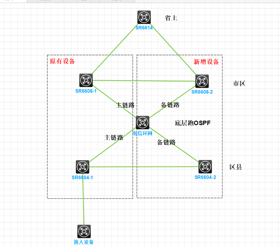 | 备链路(SR6608-2 ↔ 电信环网;SR6604-2 ↔ 电信环网) | 200M | 100 | 开销远大于主链路,仅当主链路故障时才被选中 |