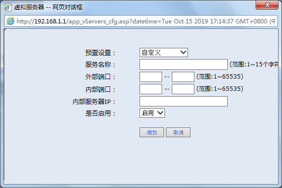 打开“高级设置” --> "地址转换" --> "虚拟服务器",然后点击“新增”,里面有“预设设置”,“服务名称”,“外部端口”,“内部端口”,“内部服务器IP”,“是否启用”这些填写项,请问应该怎么填?