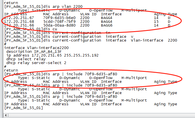 接入交换机的端口已经 配置 Access vlan 2200,汇聚查询vlan 2200的Arp 已经下发了3个IP出去了,这三个都已经注册上了AC, 唯独出现这一个获取不到,IP,