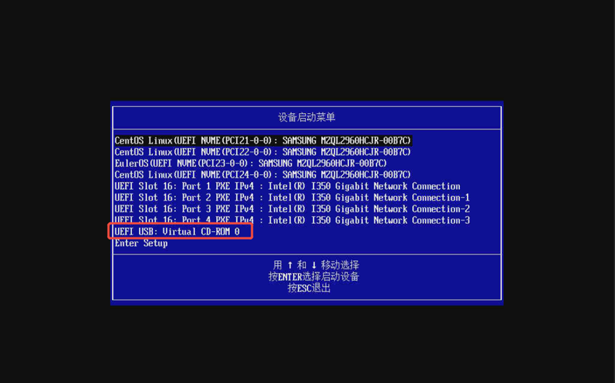 将装有阵列卡驱动的U盘插到服务器上,并在H5 KVM远程控制台的右上角CD镜像挂载准备好的操作系统镜像文件,服务器按F7进入到引导菜单(参考图4、5),选择虚拟媒体介质“Virtual CD-ROM0”开始安装操作系统。