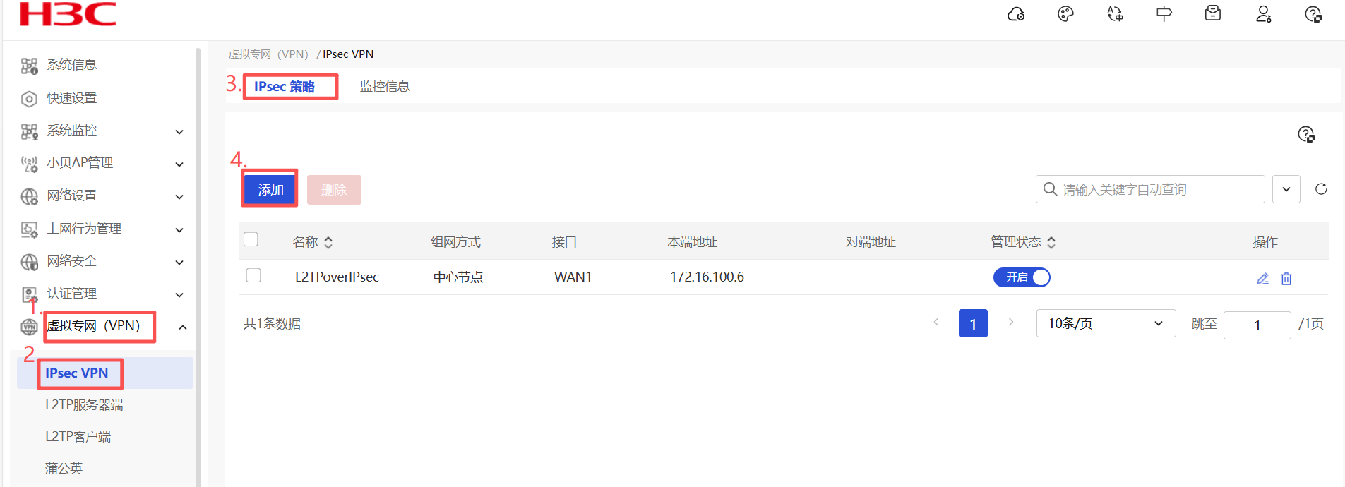 1、点击“虚拟专网(VPN)”→“IPsec策略”→“添加”