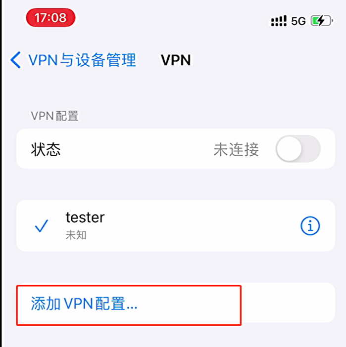 1、在设置中找到vpn与设备管理,点击“添加VPN配置”。