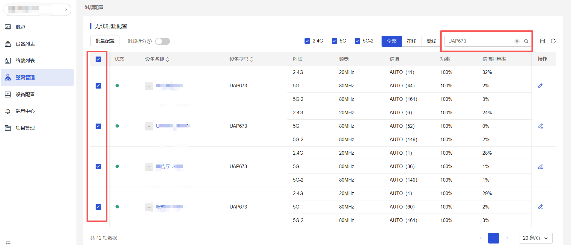 在整网管理——射频管理中,同时选中多个AP,并点击批量配置