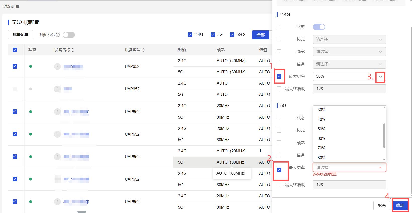 即可批量修改AP的频宽、信道、最大功率与单个AP射频最大终端接入数量