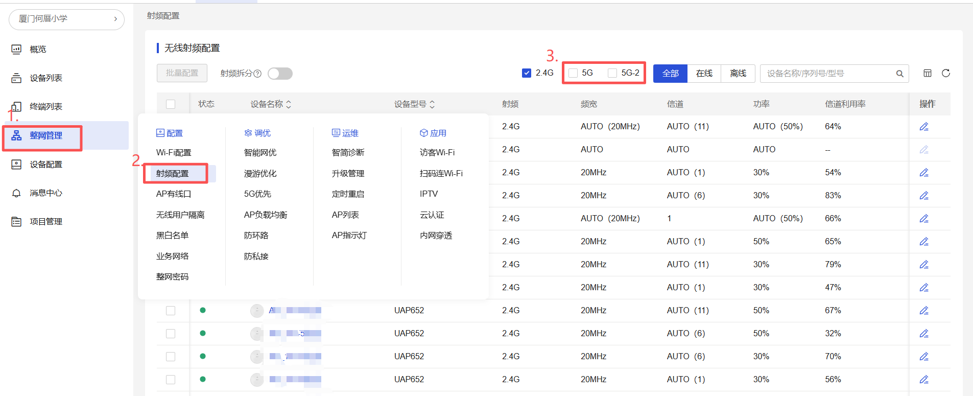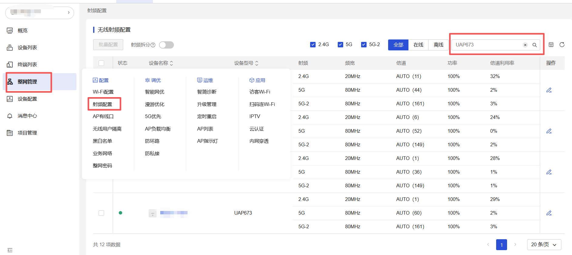 1、点击整网管理——射频管理,将5G与5G-2去掉,此处5G-2是对应三射频的AP的另外一个5G信道,如UAP673。