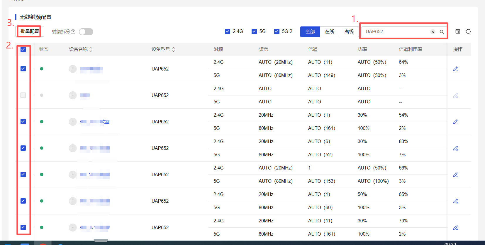 注意:目前仅简优云与小贝APP支持该功能,AP本地管理和整网管理(UWEB)暂不支持批量修改射频配置。