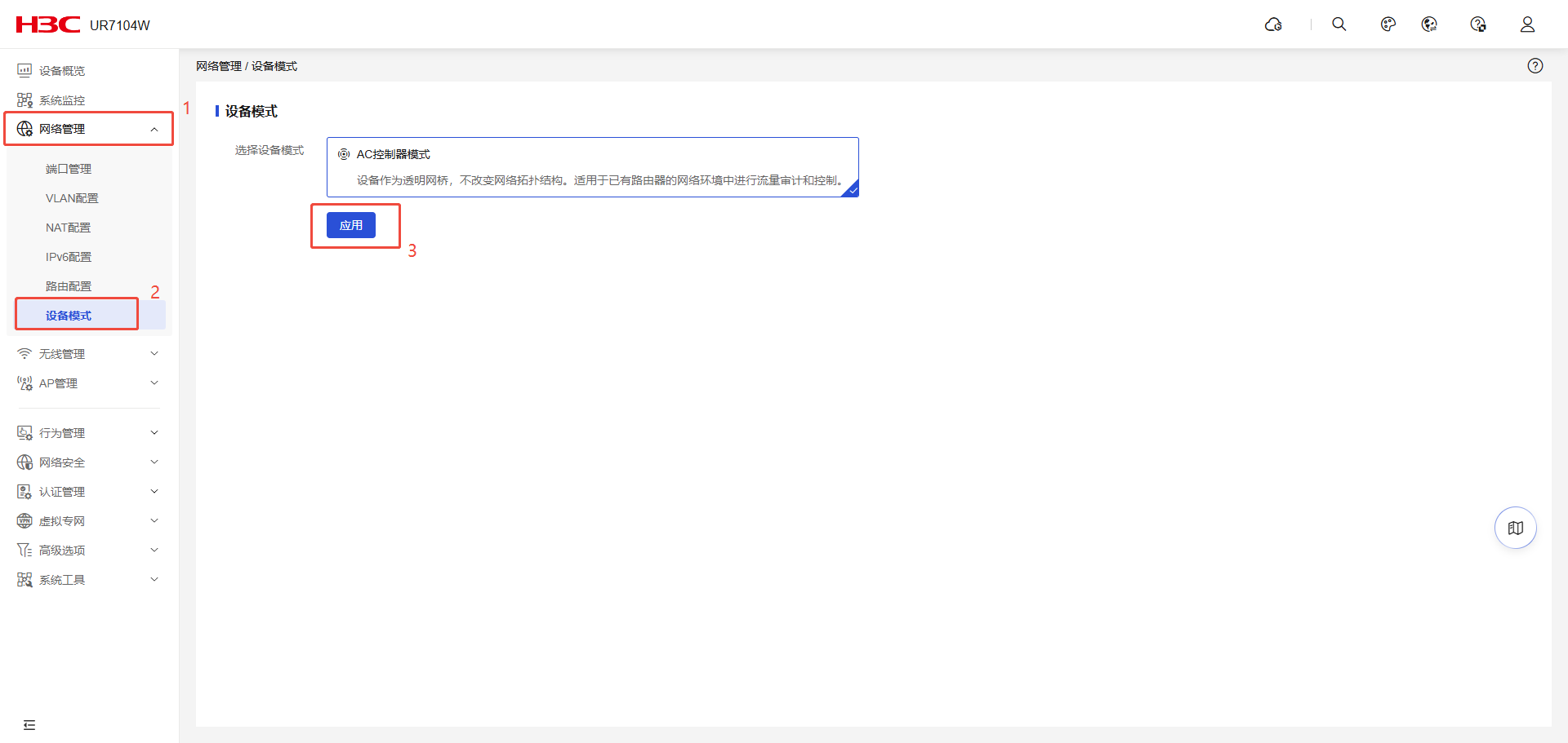 3、确认完以上事项后,点击导航栏网络管理—设备模式—AC控制器模式应用,点击弹出窗口确认按钮,进行设备模式切换