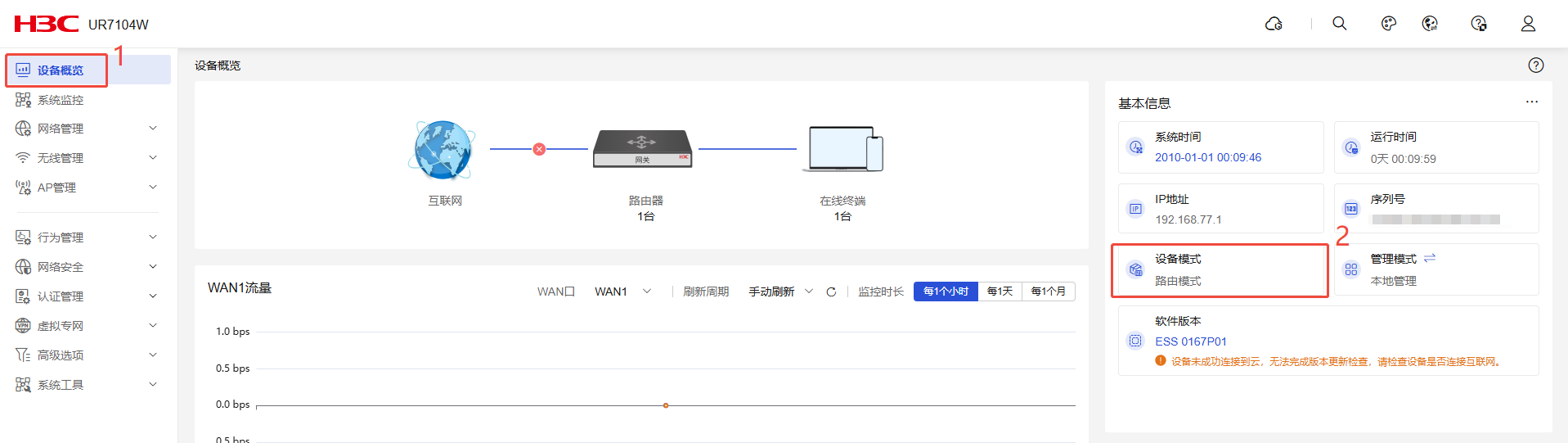 1、确认设备模式,点击设备概览—设备管理中查看当前设备状态,设备默认为路由模式